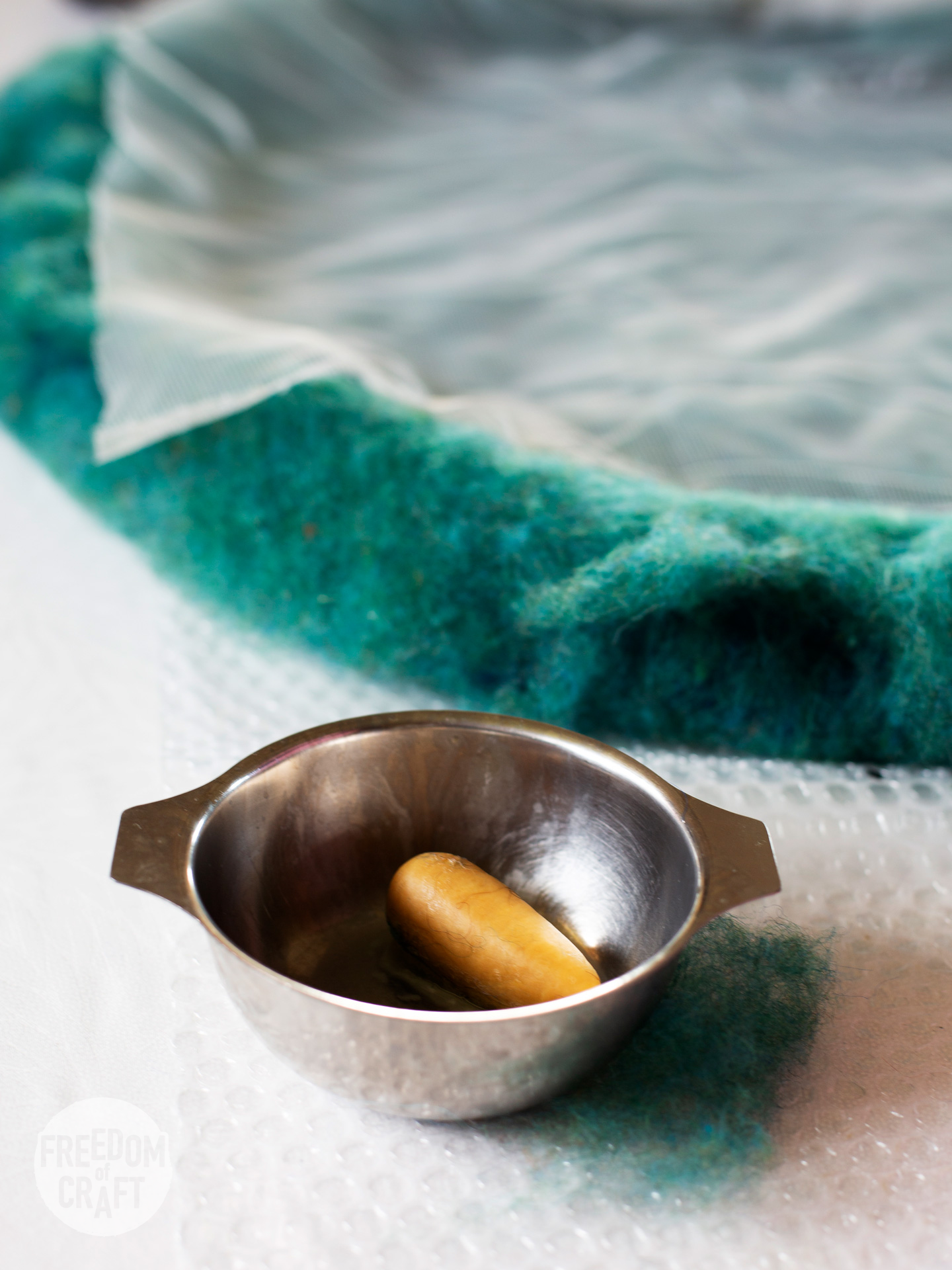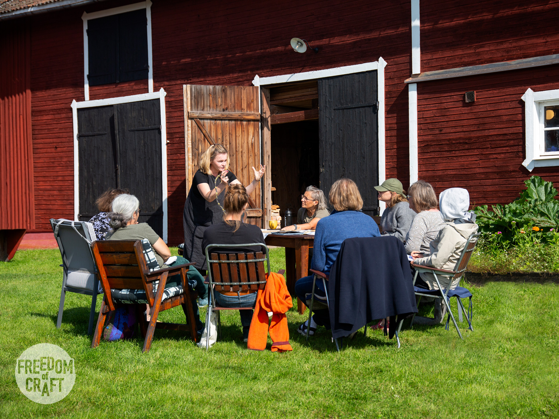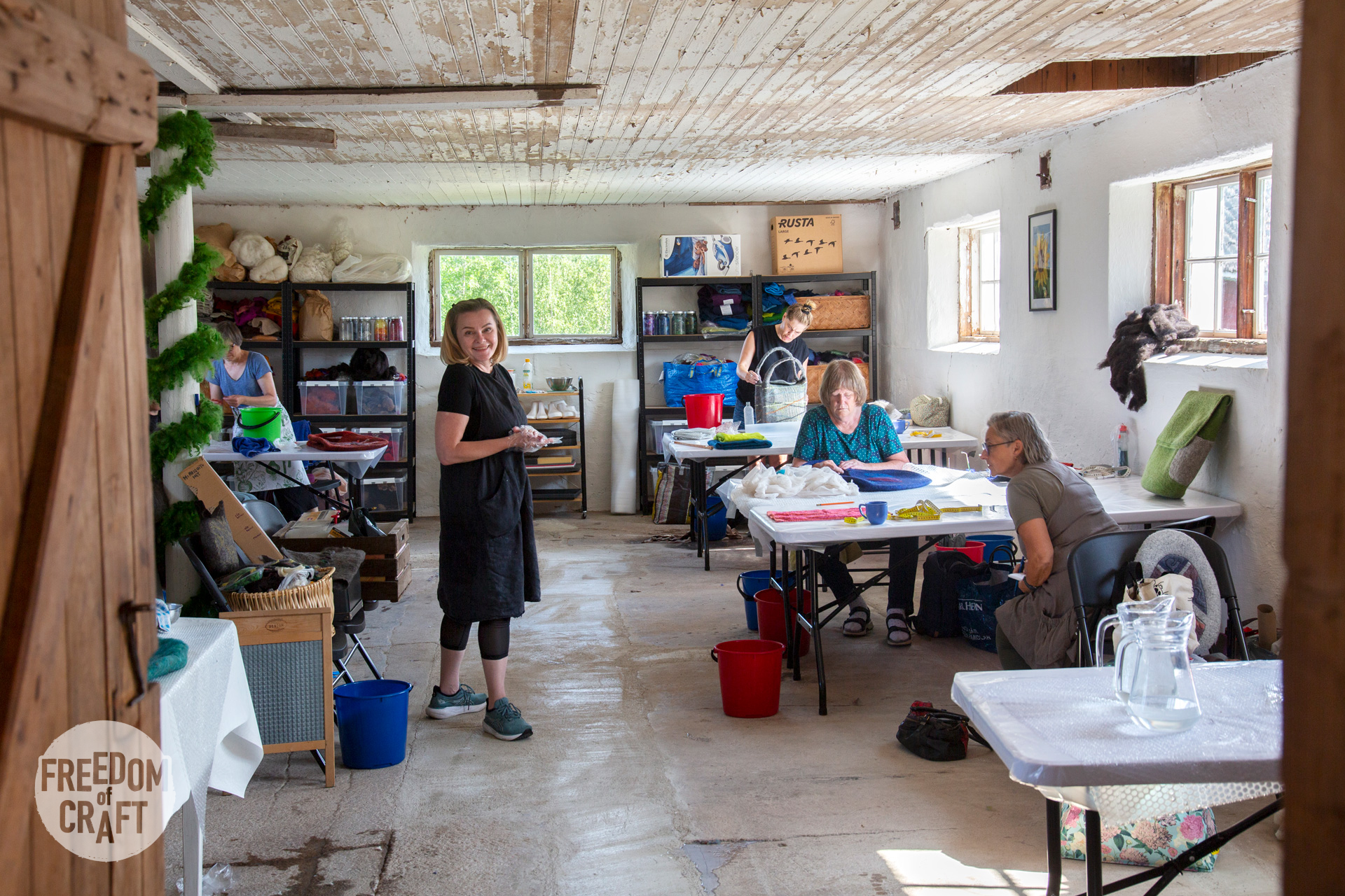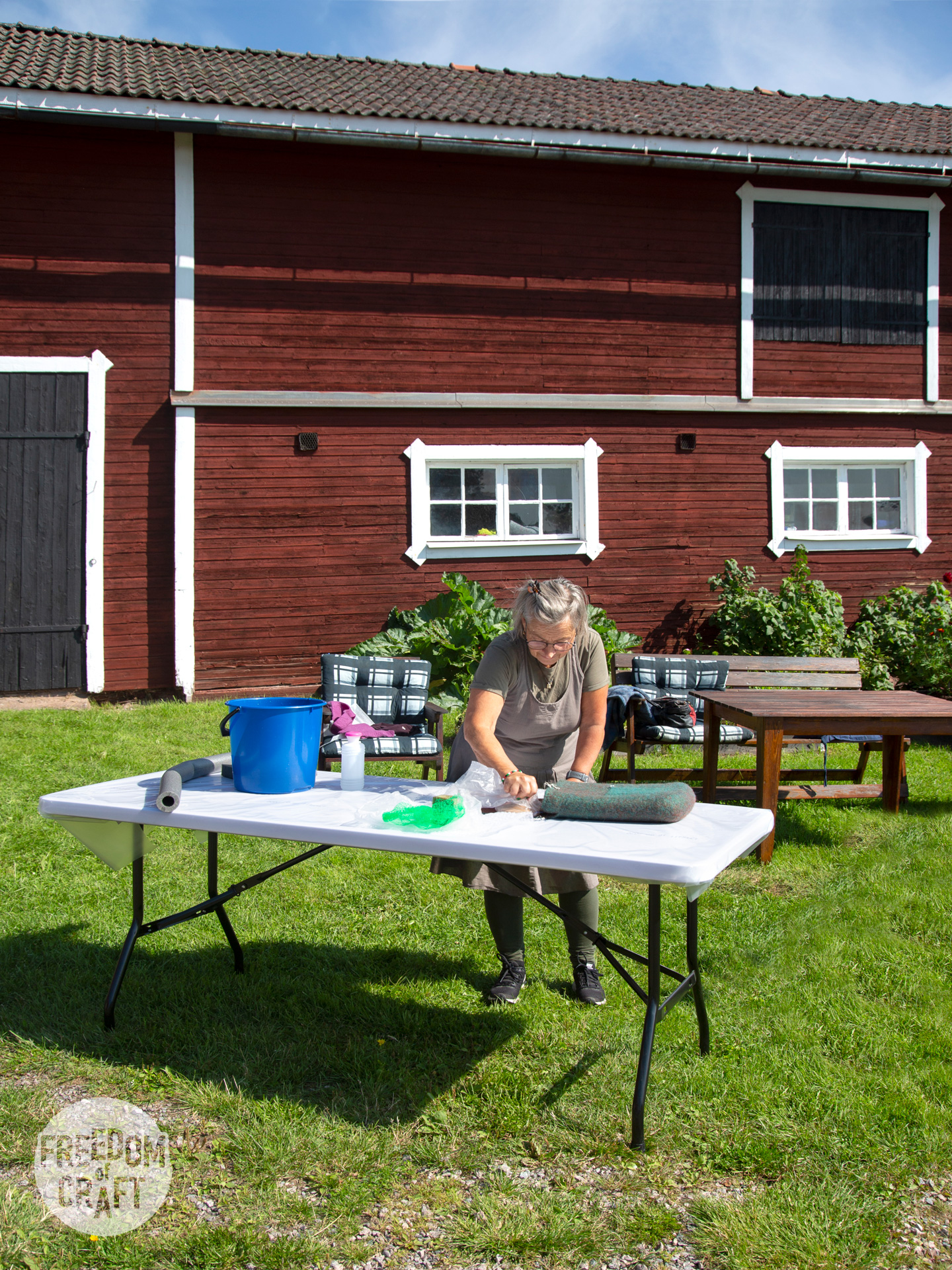 Minna från Finland arbetar med sitt projekt på workshopen En mall, många väskor, 2024. Foto: Viktoria Davidsson.Minna arbetar med handtagen till sin väska. Hon använder markisetteväv för att skydda ullen, och tvål för att göra det lättare att tova handtaget. En mall, många väskor, 2024. Foto: Viktoria Davidsson.Ateljén på Böle textle gård. Foto: Viktoria Davidsson.